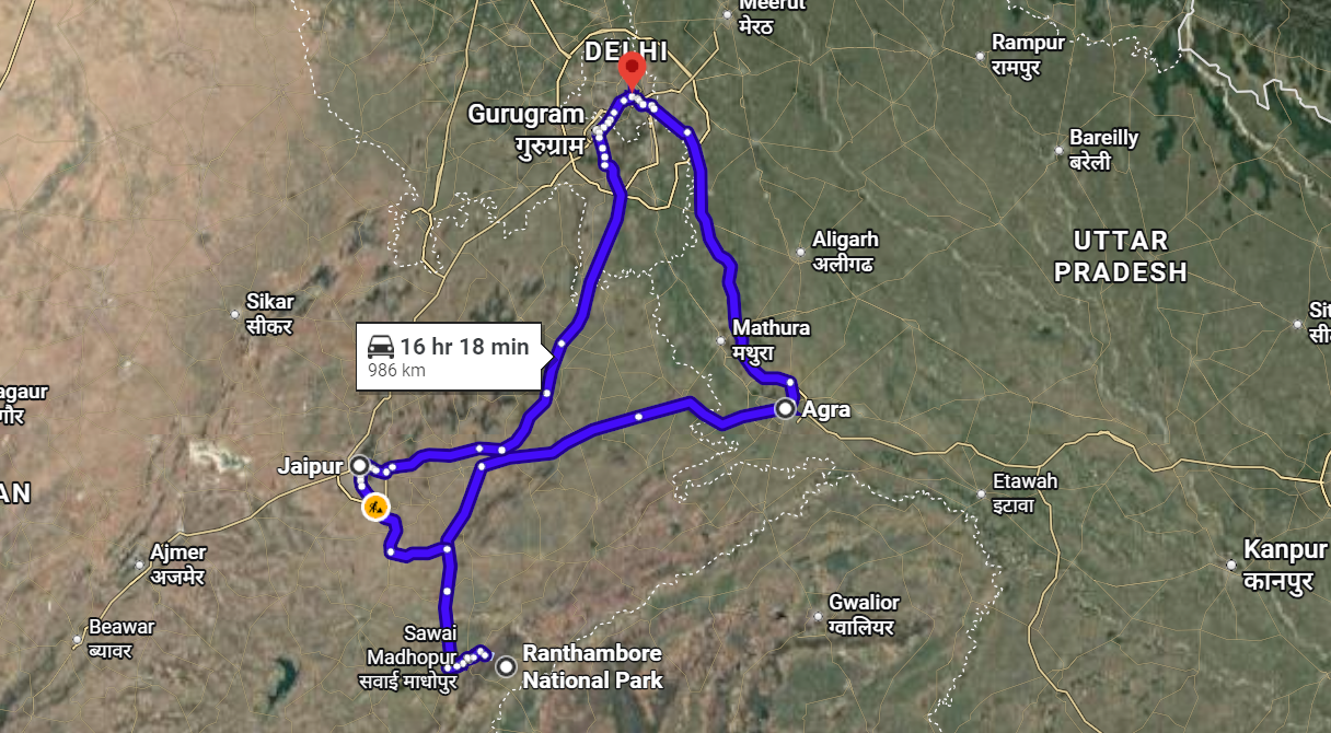 Day 2: Traveling from Delhi to Ranthambore through Agra (around 250 kilometers in 6 hours).
