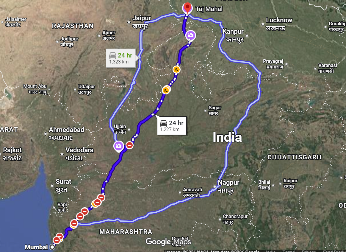 Round journey from Mumbai to Agra on the same day.