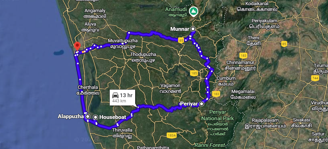 Day 5: Thekkady to Alleppey, which is 140 miles and takes about 4 hours.